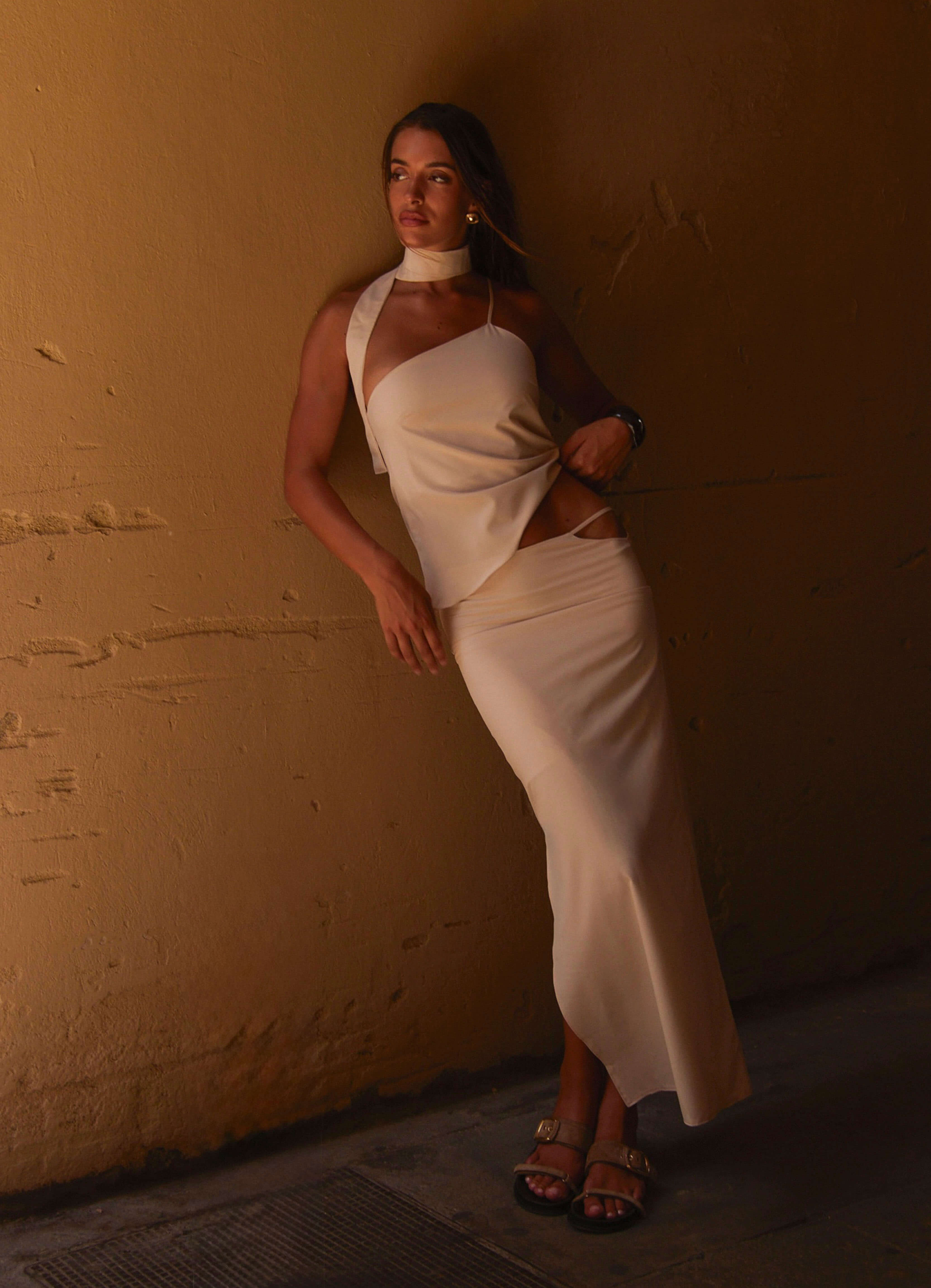 Resalta esta temporada con los polka dots. El top asimétrico de tirante fino destaca por su corte elegante y favorecedor, mientras que la falda con abertura lateral suma movimiento y sensualidad. Ligero, sofisticado y perfecto para pasear por callecitas empedradas o brindar al atardecer. Incluye pieza estilo bandana.