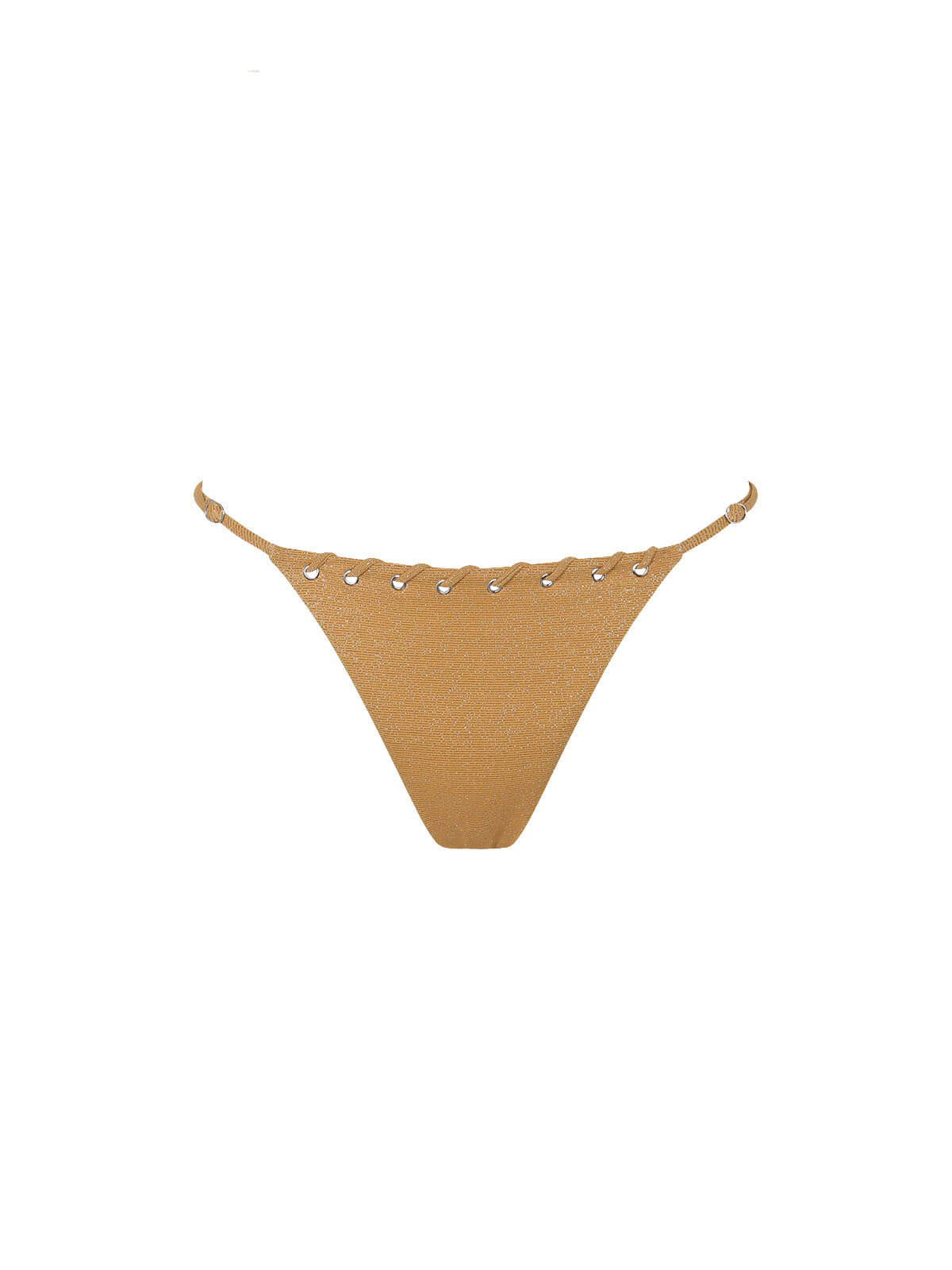 Este bikini destaca por sus ojalillos metálicos, un detalle sutil que eleva el look con un aire sofisticado. Confeccionado en lycra brillante que atrapa la luz y resalta el tono de piel, su top se puede ajustar y usar de distintas maneras, adaptándose a tu estilo y el bottom es regulable para que se amolde a ti.Una pieza pensada para destacar de manera ‘effortless’.